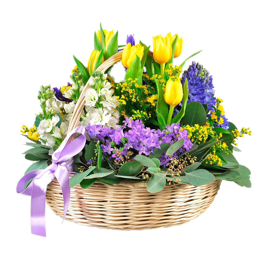 Кампанула, тюльпан, гиацинт, матиола, солидаго, ирис, эвкалипт.
